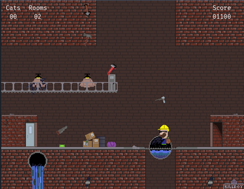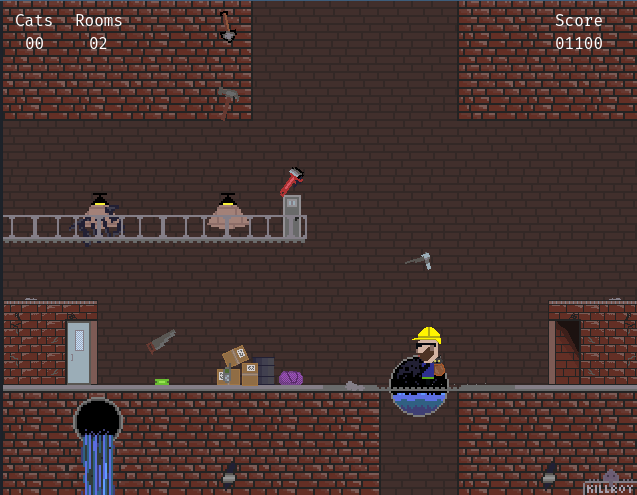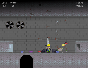 Cats may fall from above. A caught cat will hop into the player's backpack and provide a score bonus on exiting the stage. Cats which are not caught will run away. Cats can only spawn once the door opens and up to three times per stage.